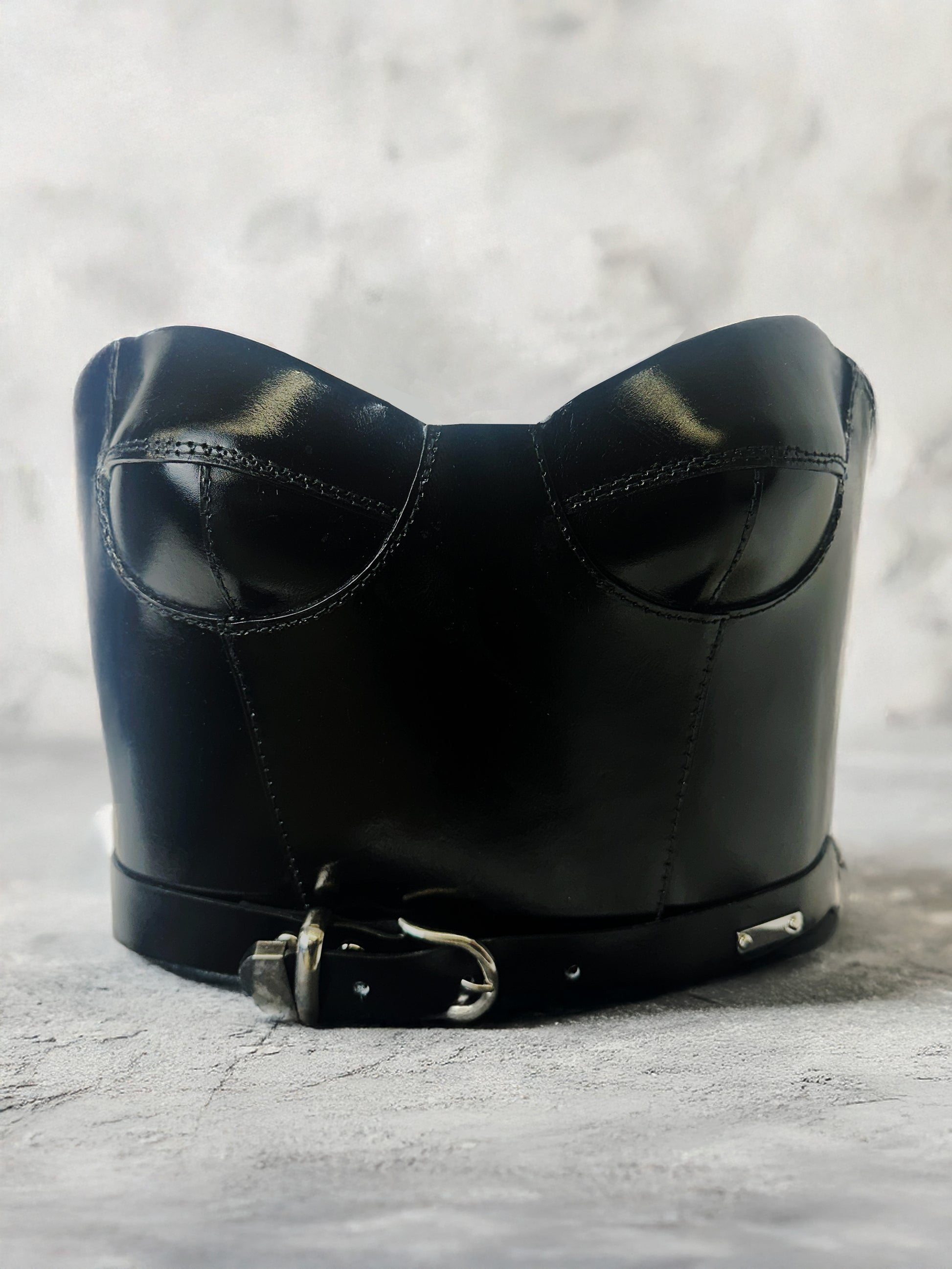 Corset Nour shinny Leather Corset. Crafted by hand in London, this exceptional piece features dual-sided paint leather, with delicate leather on the inside and shinny leather on the outside.