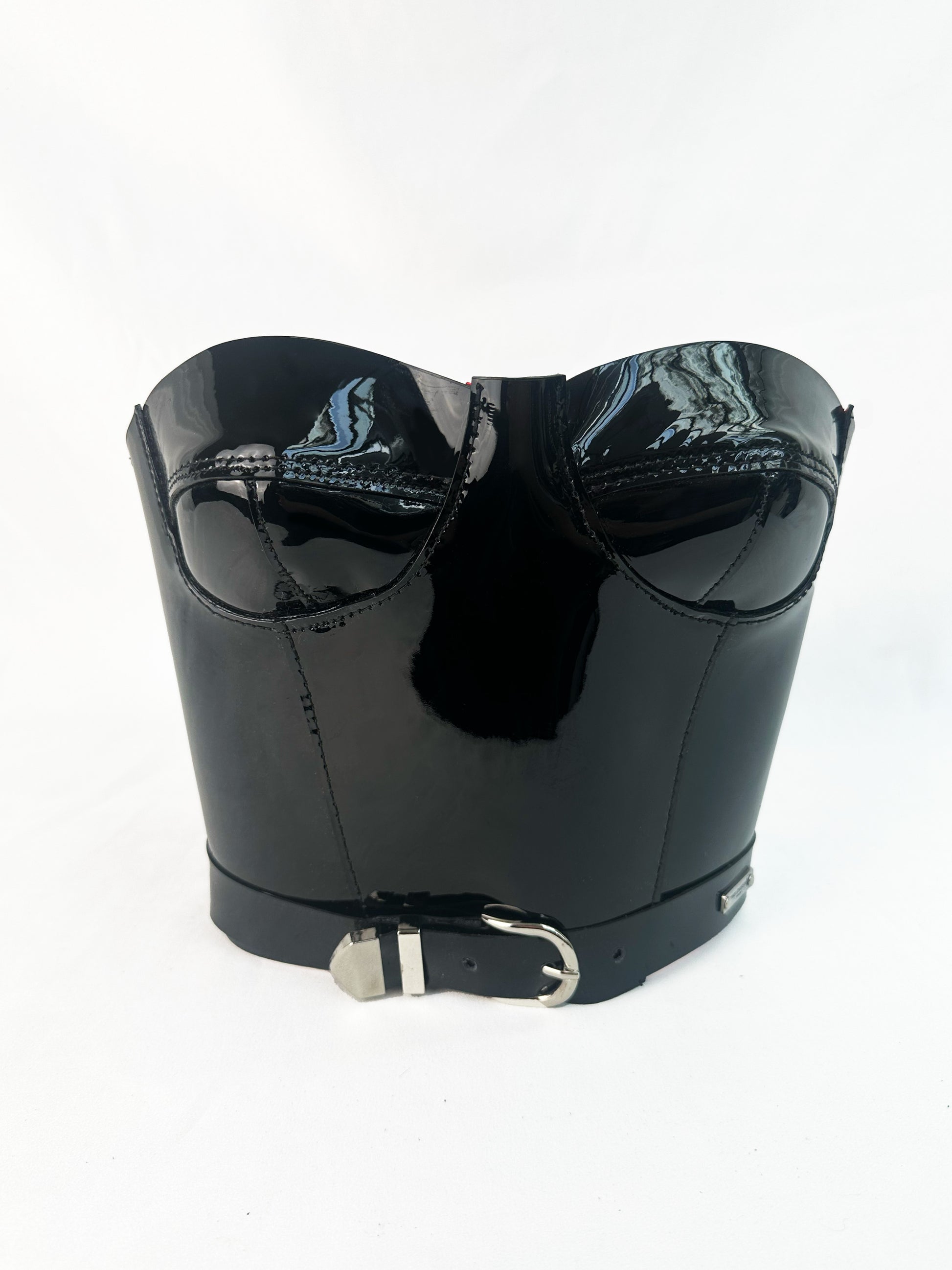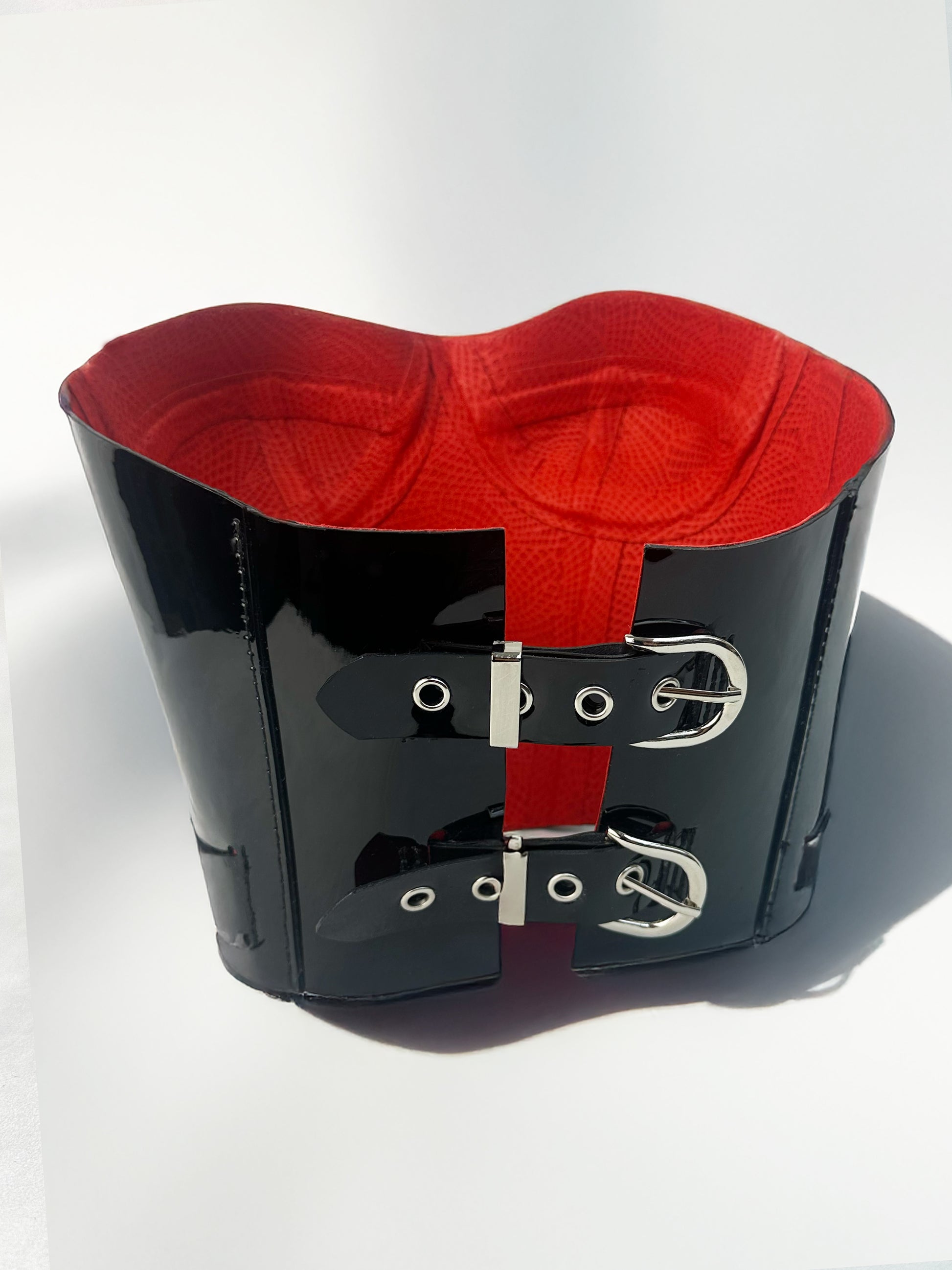 Corset Nour Patent Leather Corset, inspired by Christian Louboutin. Crafted by hand in London, this exceptional piece features dual-sided paint leather, with delicate leather on the inside and shinny leather on the outside.