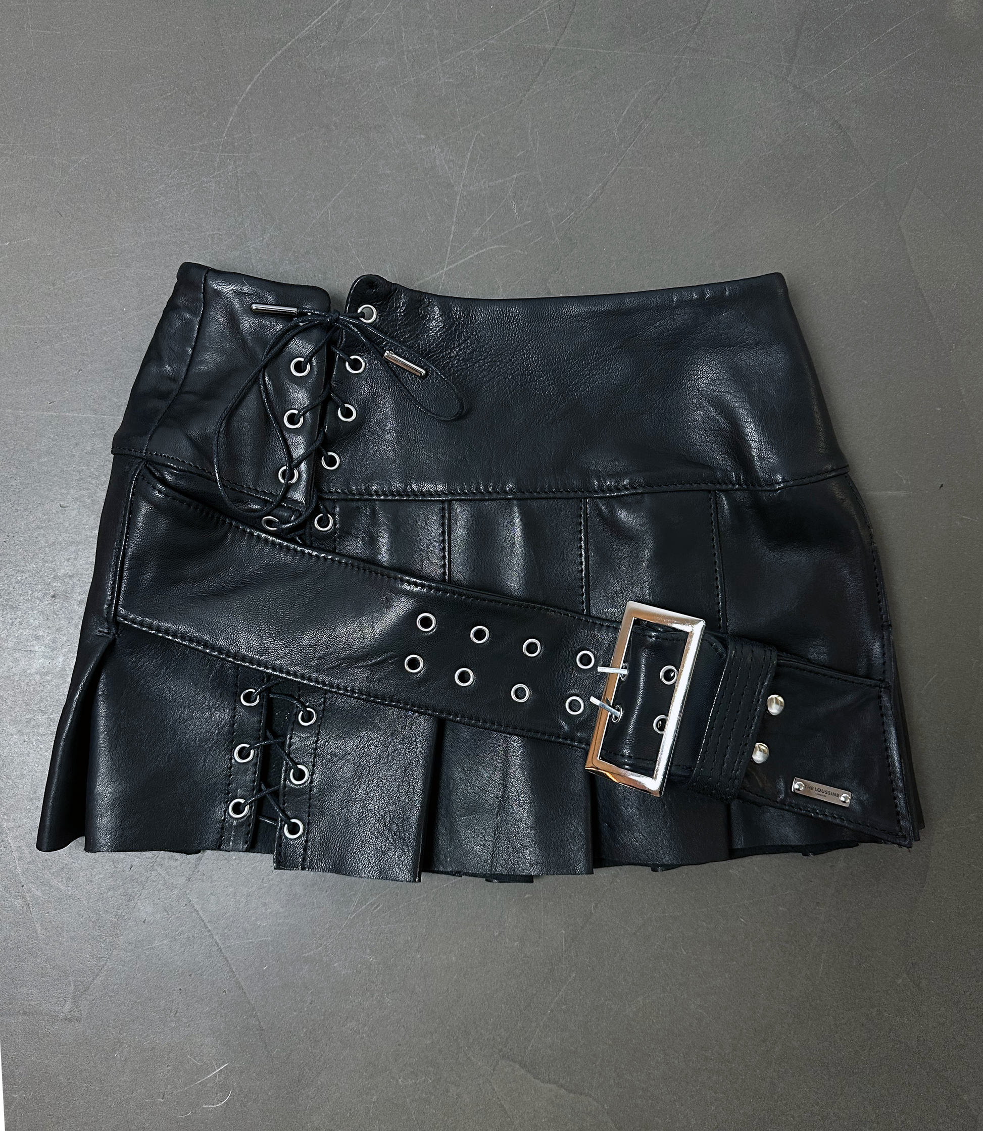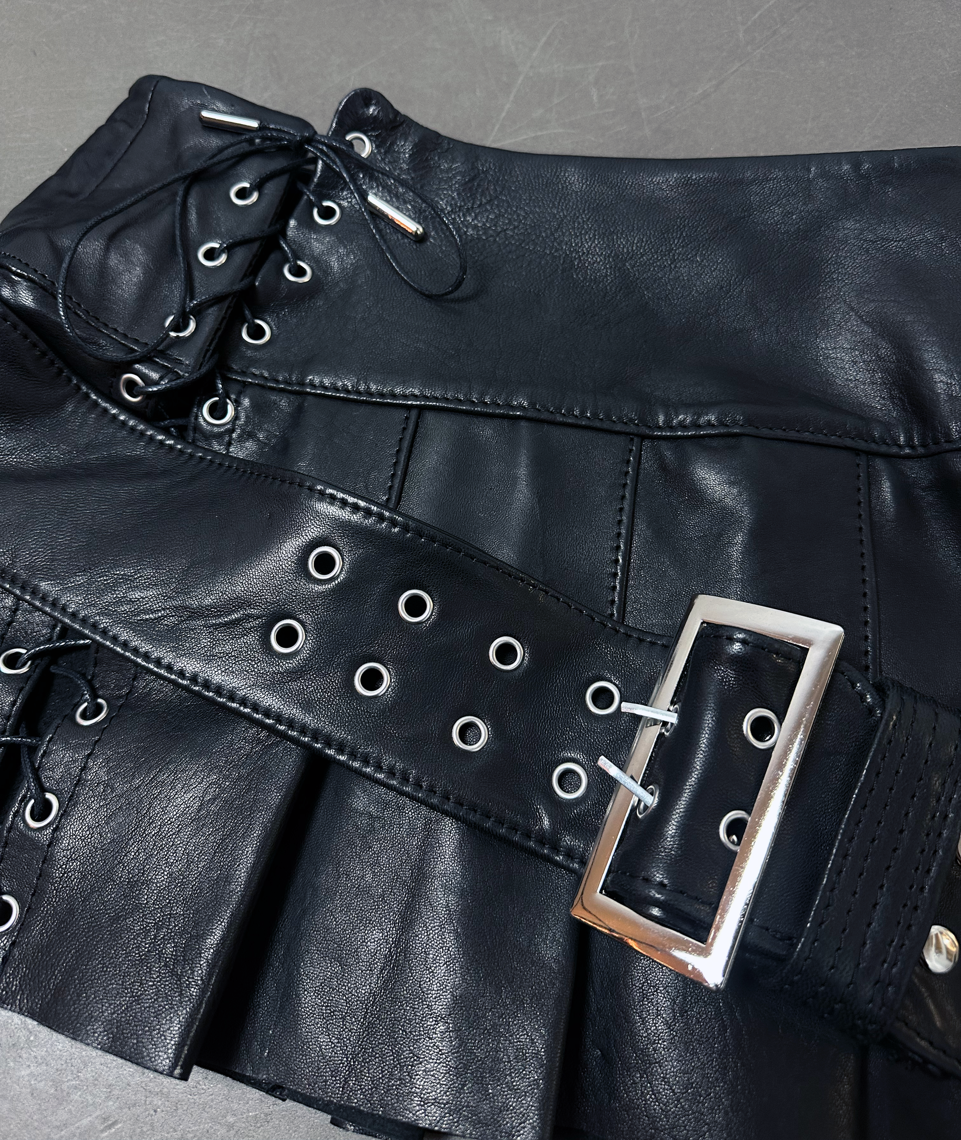 This short black leather skirt features a subtle flare and hip-sitting fit that’s easy to move in, shows plenty of skin, and looks striking worn solo or layered into your wardrobe.