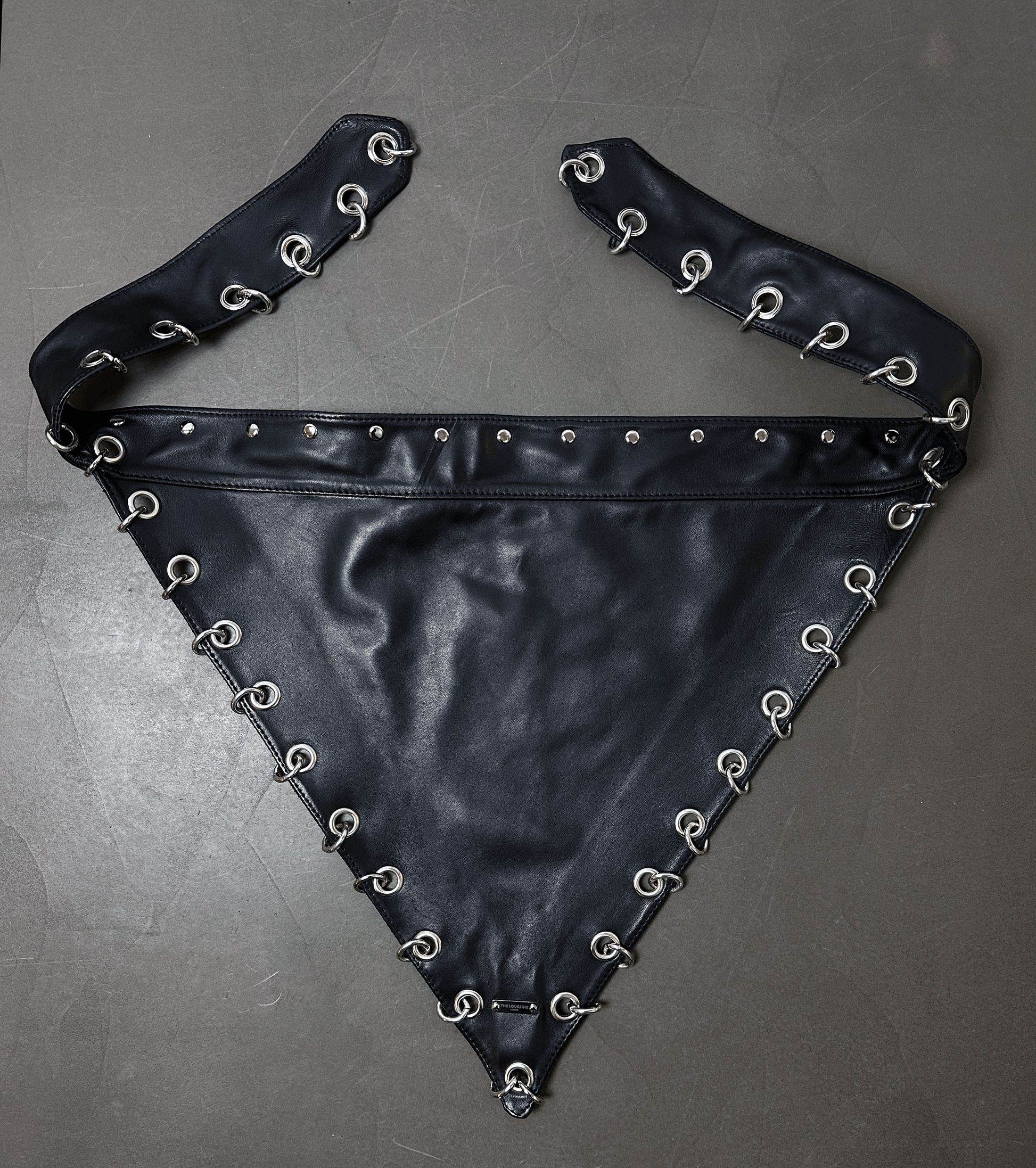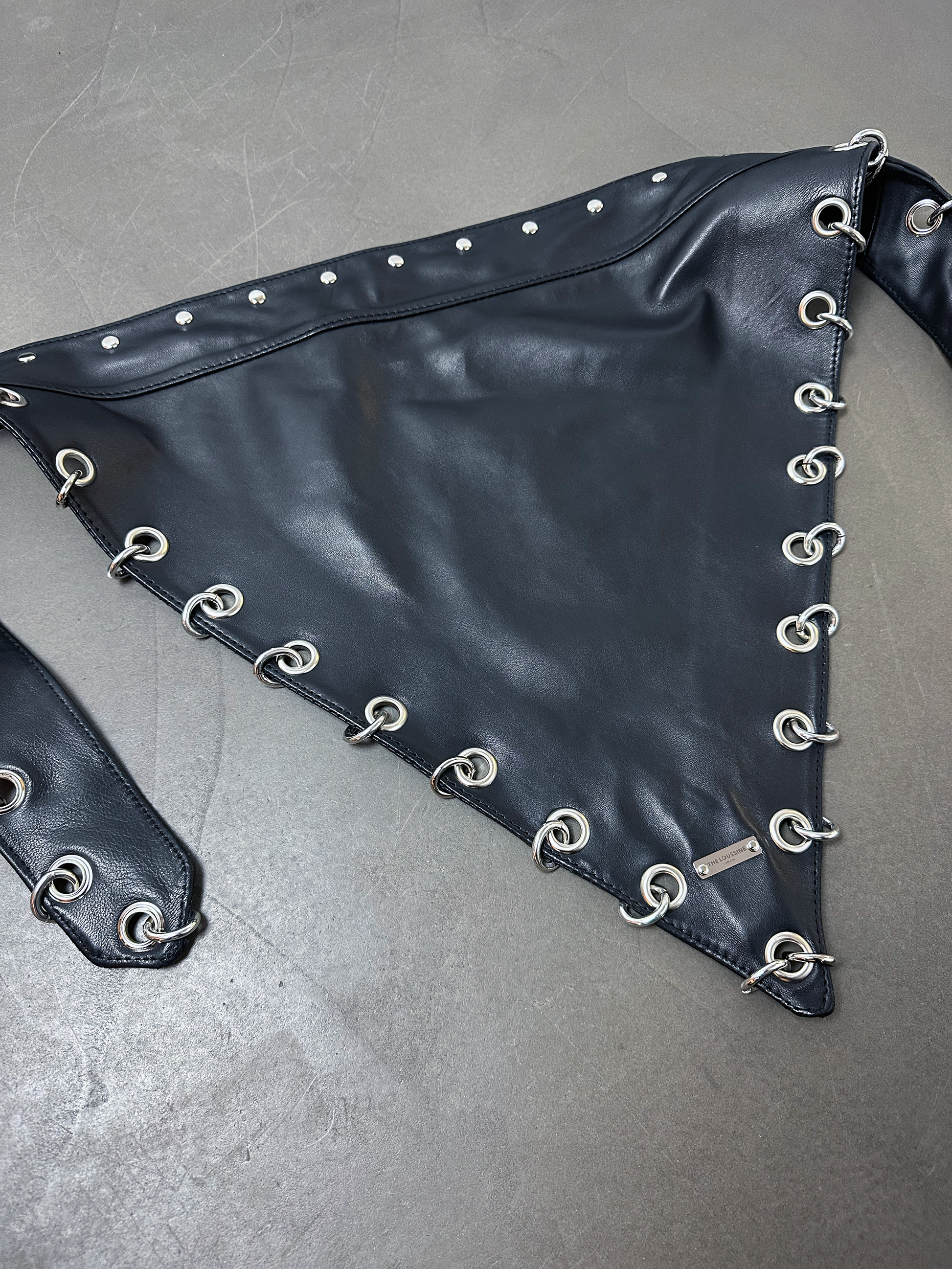 Wrap yourself in control. This headpiece/scarf combines smooth black leather and polished metal for a look that’s as raw as it is seductive.